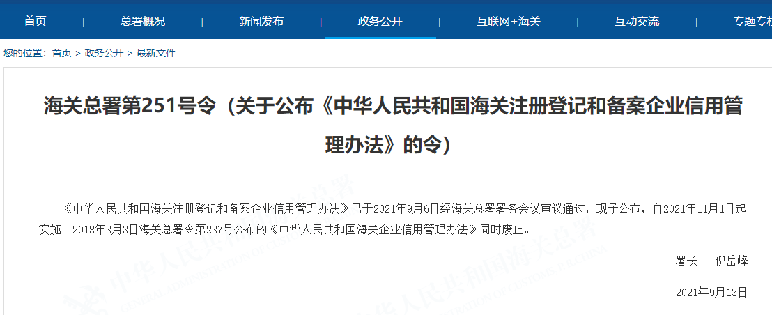 海關總署于2021年9月13日公布了《中華人民共和國海關注冊登記和備案企業信用管理辦法》(海關總署令第251號,以下簡稱《辦法》),將自2021年11月1日起施行。2018年3月3日海關總署令第237號公布的《中華人民共和國海關企業信用管理辦法》同時廢止。
