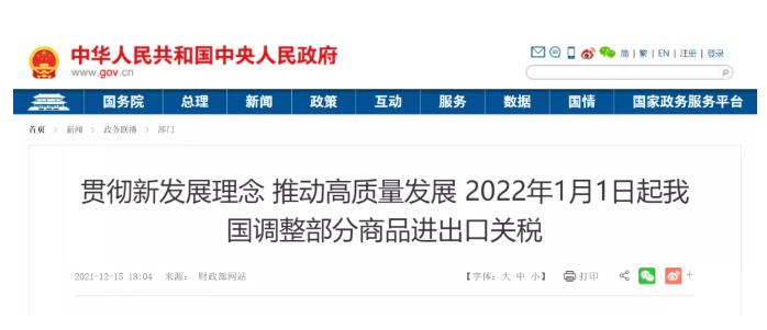 經國務院批準,國務院關稅稅則委員會印發通知,2022年將調整部分商品的進出口關稅。為完整、準確、全面貫徹新發展理念,支持構建新發展格局,繼續推動高質量發展,經國務院批準,國務院關稅稅則委員會印發通知,2022年將調整部分商品的進出口關稅。