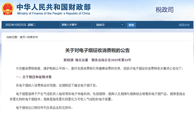 關(guān)于對電子煙征收消費稅的公告