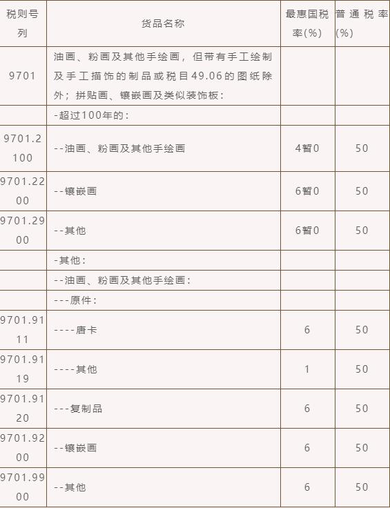根據(jù)《中華人民共和國進(jìn)出口稅則(2022版)》,繪畫作品的稅則號列和部分稅率如下(協(xié)定稅率及特惠稅率等詳見2022年稅則):