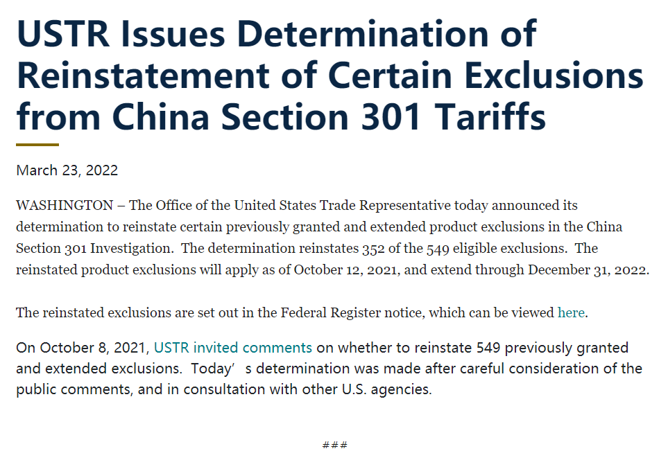 本次USTR公告和關(guān)稅豁免商品清單鏈接為:https://ustr.gov/sites/default/files/notices/FRN%20for%20Notice%20of%20Reinstatement.pdf